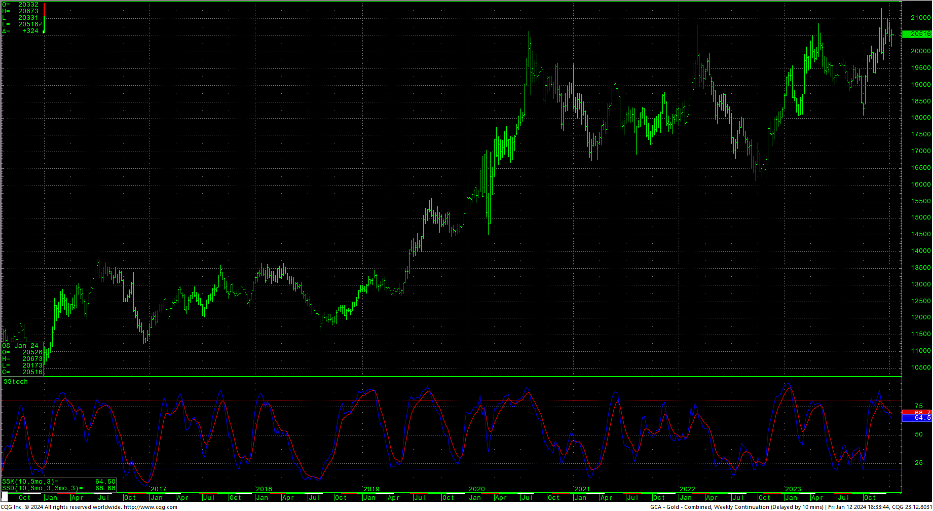 Stocks continued the ‘running correction’ action that marks 2024 thus far with tech stocks leading the charge for the week. So far, the activity this year can be construed as bullish action that marks the end of the first impulse wave of this move. That said, the US stock market is running hot (The US is now 54% more expensive than the rest of the world…) compared to all other global markets and earnings are just starting to come out. The past week’s trade does little to the sentiment indicators as they remains mostly greed/extreme greed. Both the Dow and the S&P hit new intraday trading highs for this drive on Friday and both those markets have worked off the overbought condition on the daily charts with each trying to show a hook higher in the slow stochastics. The hourlies are neutral. The FANGhit a new record high as that index led all the markets for the week. The weeklies are all moving into overbought territory. Timing-wise, the critical timing of Monday-Tuesday was marked by some sharp volatility which made for great short-term options trading. Secondary markets continue to dog, following the larger trend of the past few years and the RSP/SPY took a big hit on the weekly chart. One chart being given a zombie rebirth in 2024 (particularly after the past week’s CPI report) is the “inverted yield curve” between the 2YR and 10YR. A few notes, the first is that the curve has been inverted since mid-2022, the second is that the chart looks to be forming an inverted H&S pattern that suggests the curve will turn positive again this year. Finally, it seems that if we learn anything from last year, it is that long held prediction tools have flopped tremendously and it does not seem smart to bank on what may become an outdated indicator in this new world. Also note that the TLT Monthly has a large bullish divergence on it and further trade above 100 should minimally test 105.38 and 109.68.