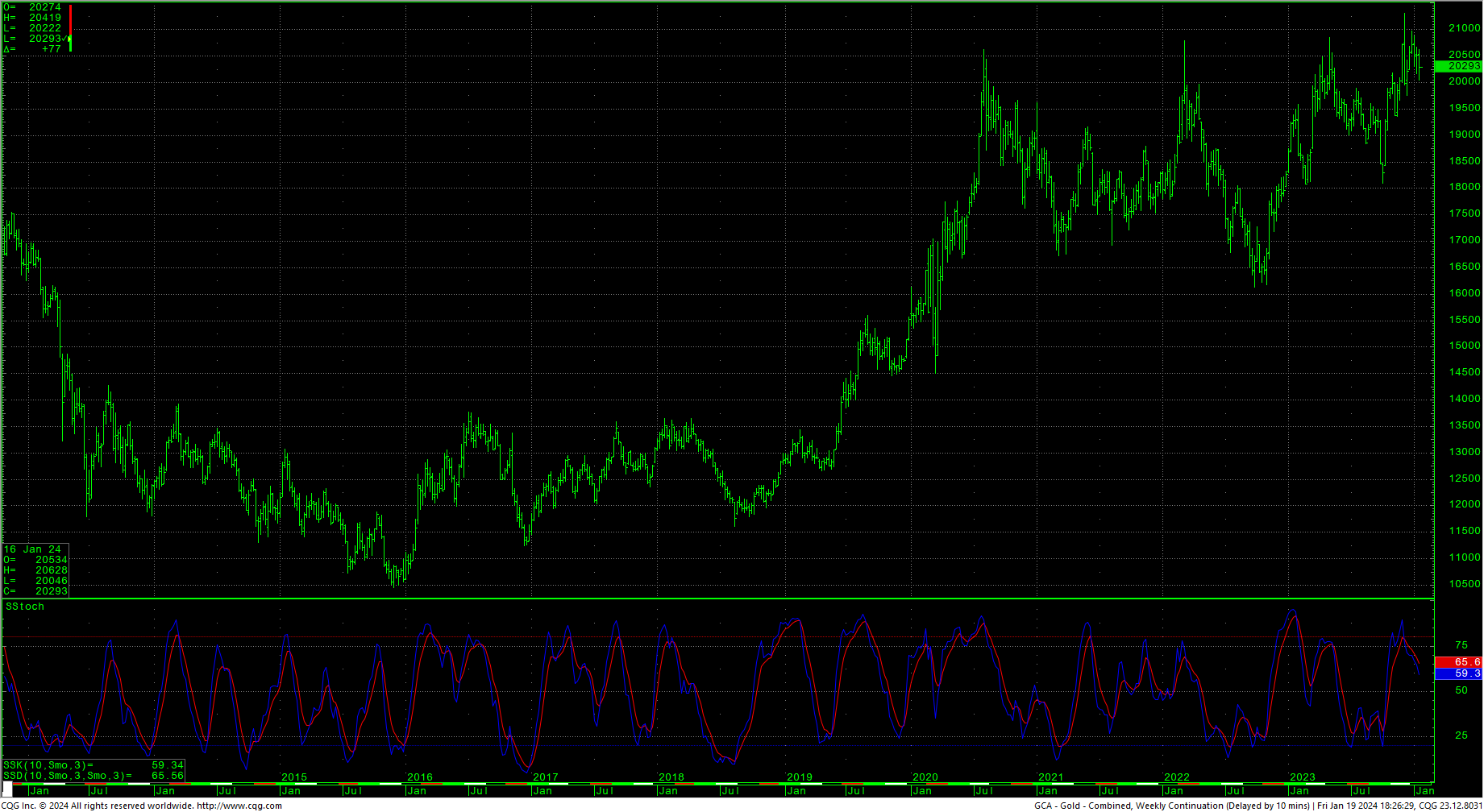 The S&P hourly is overbought on Friday’s close. The market set new record highs, for the first time since January of 2022. Resistance is 4842 and 4849/4850. Rallies over 4850 should test 4952 with a shot at potential upside targets in the 5144 area. Closes over 5144 set up a drive to 5288 with counts to 5432. A breakout over 5432 will open potential to the 5720 area.