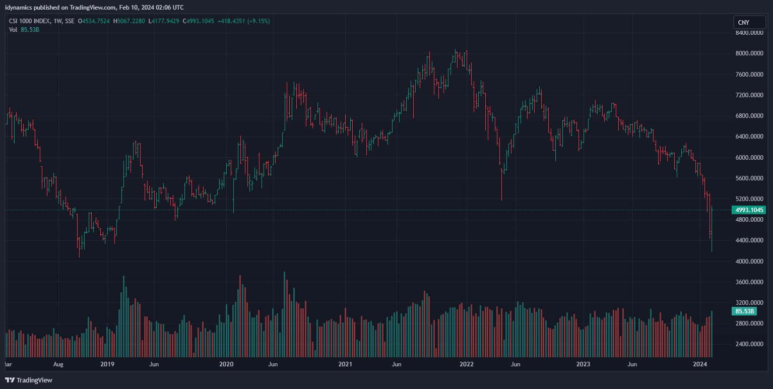The Dow traded an inside week, eking out a fractionally higher close, in the upper end of the week’s range. Psychology continues to be very much in favor of a third-wave move. There are friendly earnings with selloffs, negative news with the meltdown in commercial real estate, declining breadth, there is ‘cautionary’ discussion as prices notch record highs, and there is no sign of crazy mania…even with sentiment remaining high. The Dow has targets just overhead at 39075 and, with the S&P crossing a critical milestone, continued rallies should get discussions going about Dow 40K. BRKA shares continued their explosive tear to the upside. One other note, China pulled out an upside reversal last week after totally manipulating their markets.