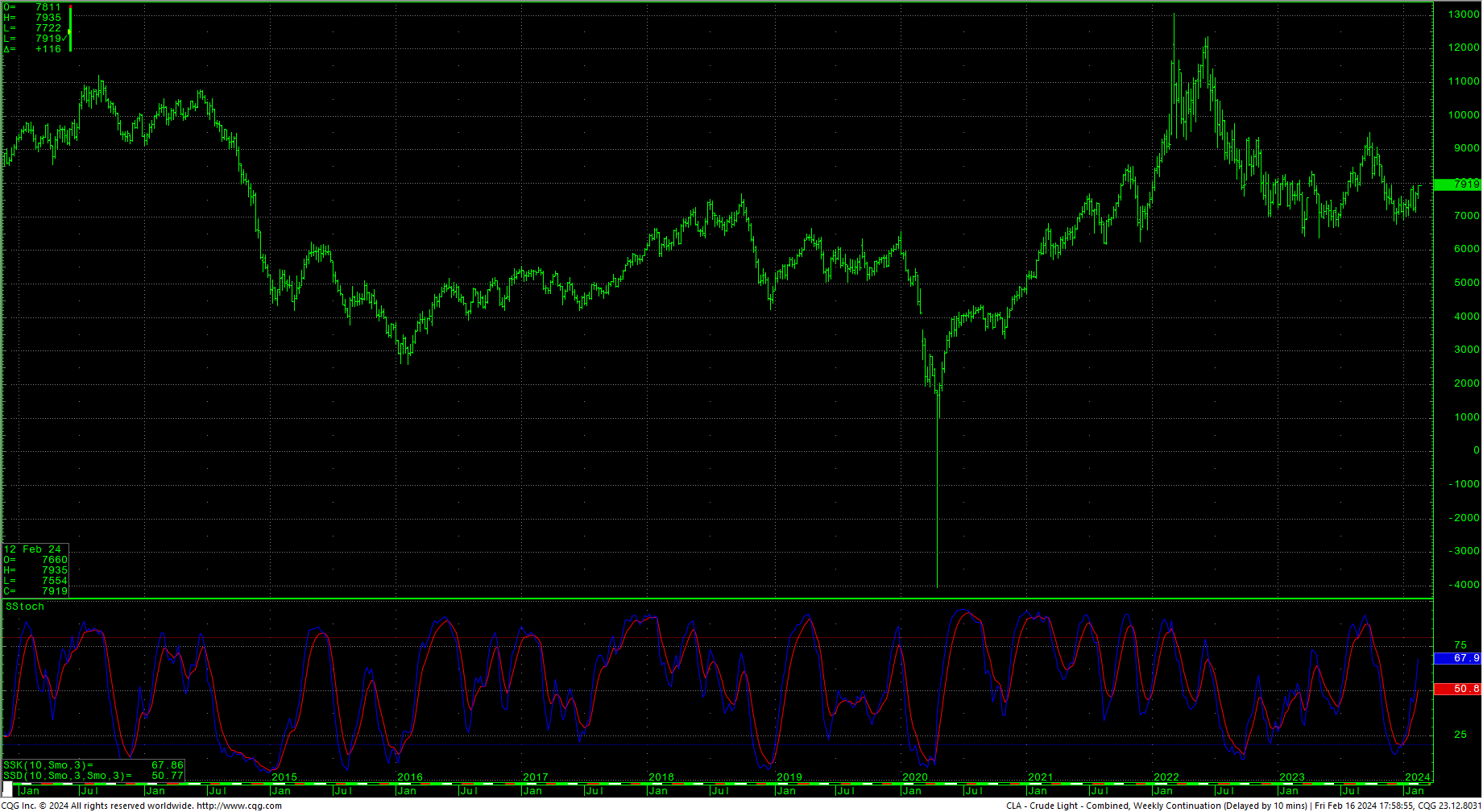 The Dow traded an outside week, ending fractionally lower close, in the upper end of the week’s range. The weekly charts are definitely into overbought conditions now. There remains the potential for stocks to be on the edge of a melt-up in a third-wave move. We are still at the very, very early beginning of the tech revolution and “data is the new oil.“That said, the selloff in bonds and the continued greed/extreme greed readings are cautionary. BRKA hit record highs and closed at a new record. The Buffett Indicator is still below the highs set in late 2021. The rally in the Russell set up a strong up week for the RSP-SPY weekly and that chart needs to be looked at as a potential double bottom forming.