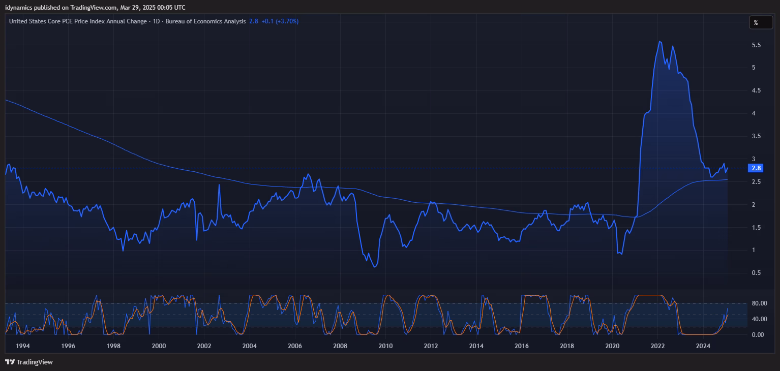 “The GDPNow model estimate for real GDP growth (seasonally adjusted annual rate) in the first quarter of 2025 is -2.8 percent on March 28, down from -1.8 percent on March 26. The alternative model forecast, which adjusts for imports and exports of gold as described here, is -0.5 percent. After recent releases from the US Census Bureau and the US Bureau of Economic Analysis, the nowcast of the contribution of net exports to first-quarter real GDP growth declined from -3.95 percentage points to -4.79 percentage points in the standard model and from -1.92 percentage points to -2.53 percentage points in the alternative model.”—Atlanta Fed