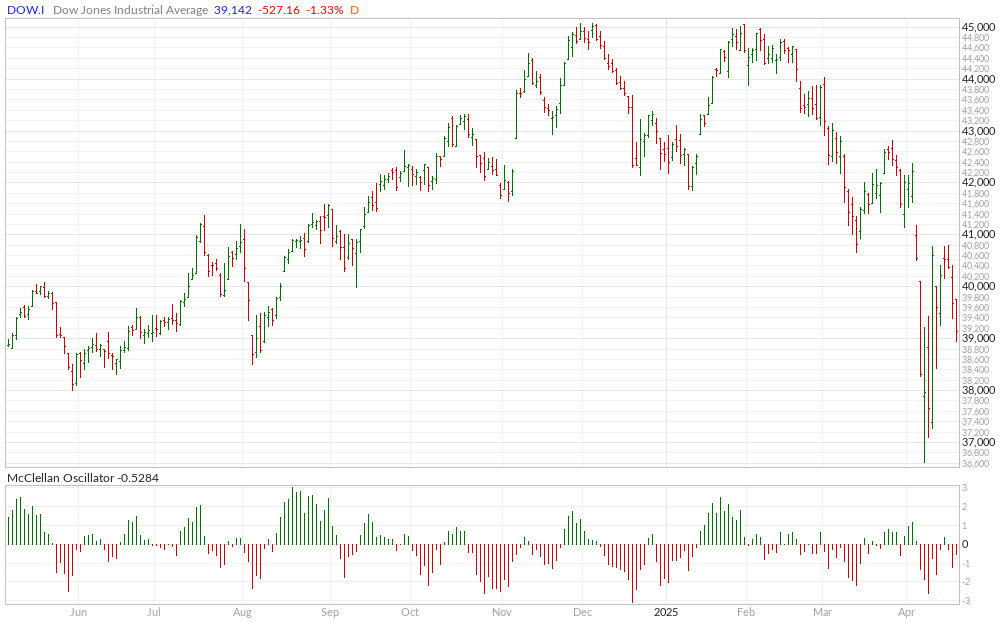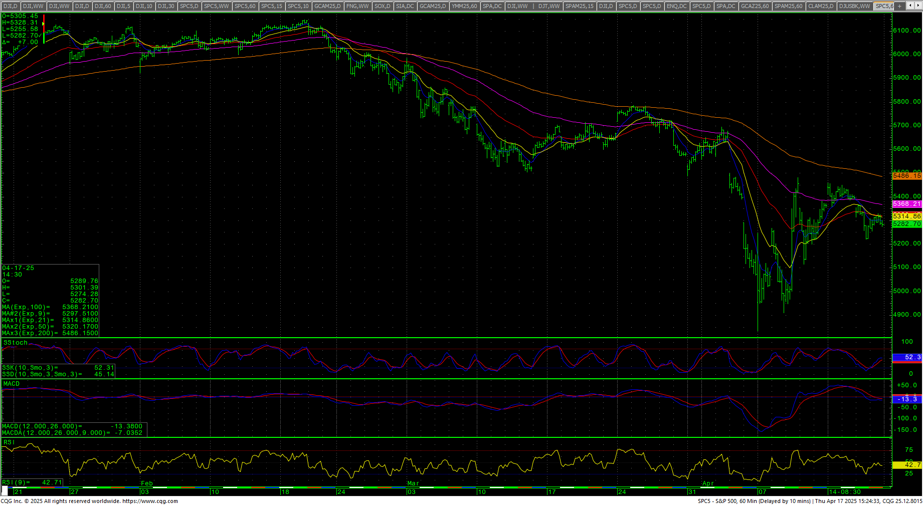 The Dow started the week higher on more tariff news and then declined to close out a reversal week on the bottom of the range. It is a higher high and a higher low on the weekly with a bearish candle while the daily posted four bearish candles in a row. The market is building value under “Liberation Day” and there is nothing technically that offers a friendly picture…only the sentiment numbers. Both the daily stochastics and the MACD are threatening to hook lower, RSI is at 39.31. As mentioned above, the daily now has a Death Cross on the moving averages. The weekly remains in a sell signal. Prices are sitting right around a .382% retracement of the vault off the spike low on Monday, 7 April 2025. The 200-day MA starts the week at 41748 as it is now trending lower.
