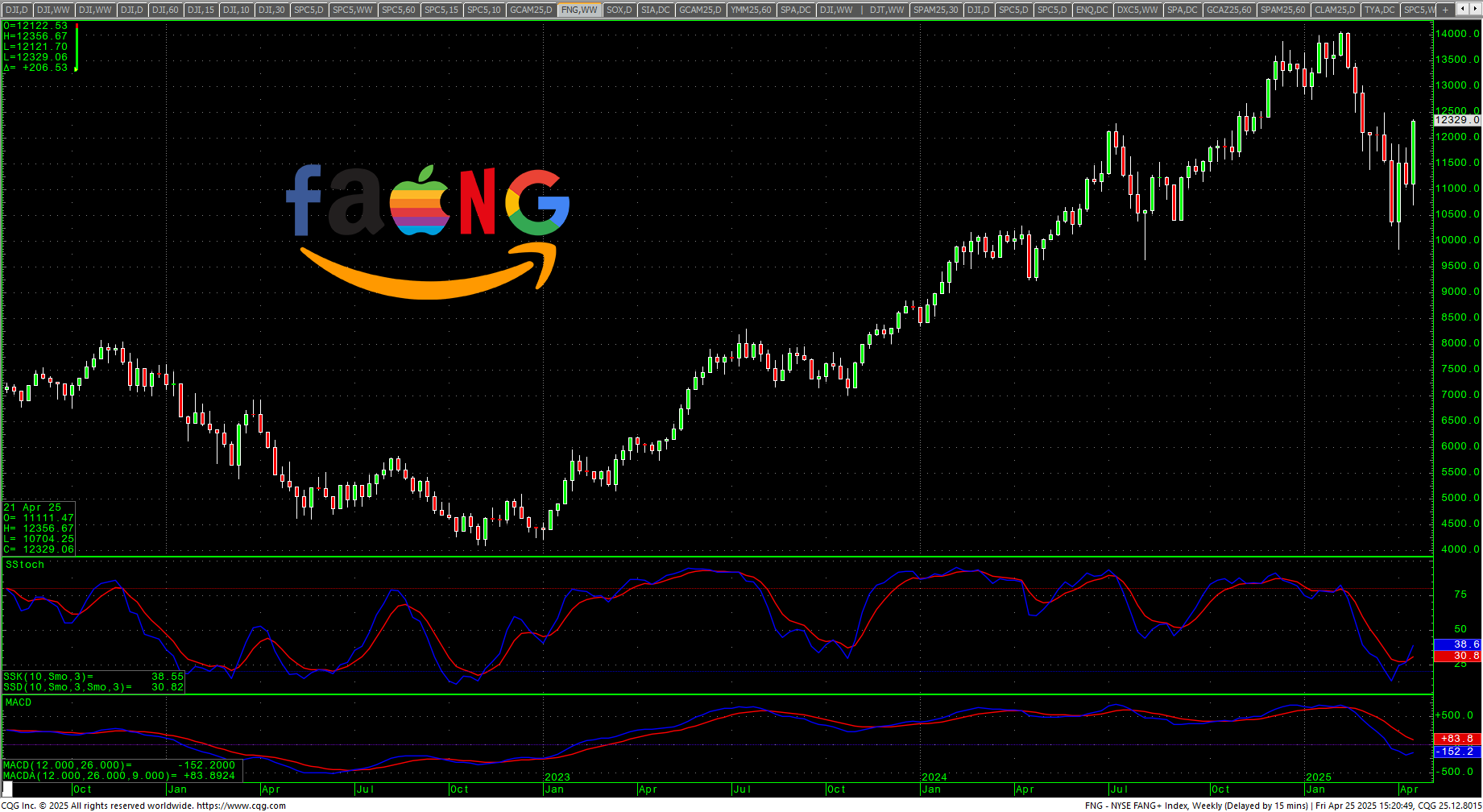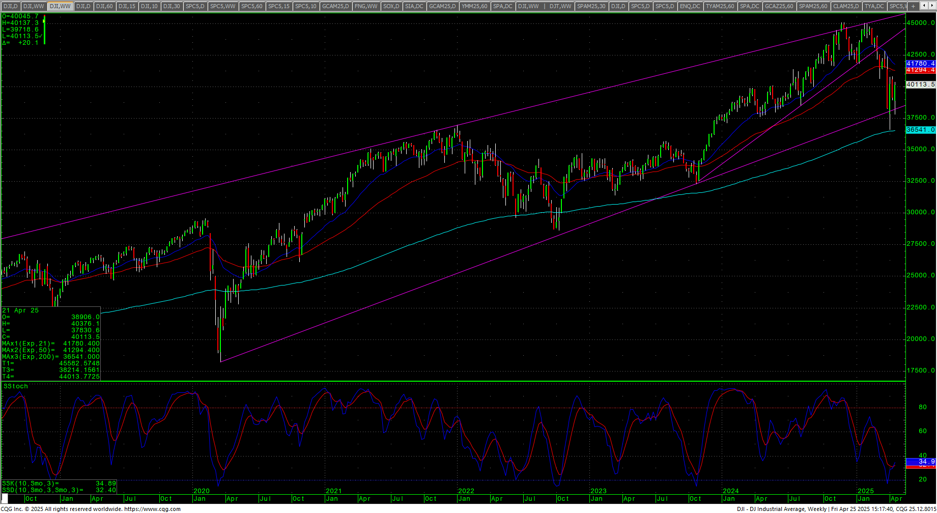 The Dow started the week sharply lower on Fed Chair freakout, with prices opening at the opening level two weeks prior…and then the spin machines started, and the options exploded with stock prices following. The market is building a massive flagging pattern under “Liberation Day” and the technical picture is mixed, even with the bullish action last week. ly that offers a friendly picture…only the sentiment numbers. Both the daily stochastics and the MACD are up but could easily hook lower, RSI is at 51.40. As mentioned above, the daily now has a Death Cross on the moving averages. The weekly remains in a sell signal but is trying to hook higher. Prices have retraced a little under .618% of the drop from 26 March 2025 to the spike low on 7 April 2025. The 200-day MA starts the week at 41636 and is picking up steam trending lower.