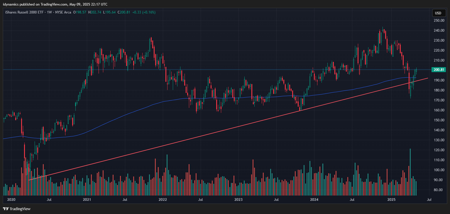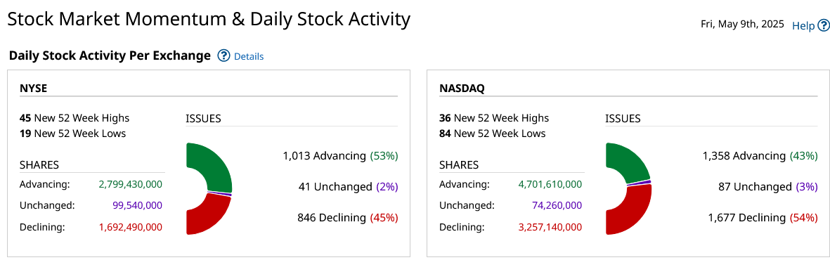 Sentiment has shifted sharply away from its deeply oversold readings to greed and extreme greed with the strong rally. The volume is pathetic and represents typical “distribution.” The S&P closed fractionally lower on Friday and ended the week down about a half percent, the first weekly loss in four weeks and putting the SPX just a hair under the close on “Liberation Day.” Momentum is slowing, even though Dow Jones ‘new highs’ hit a record high last week. The RSP eked out a net positive for the week and the RSP:SPY is struggling near multi-year lows. The ratio has basically been flat for almost one year now.