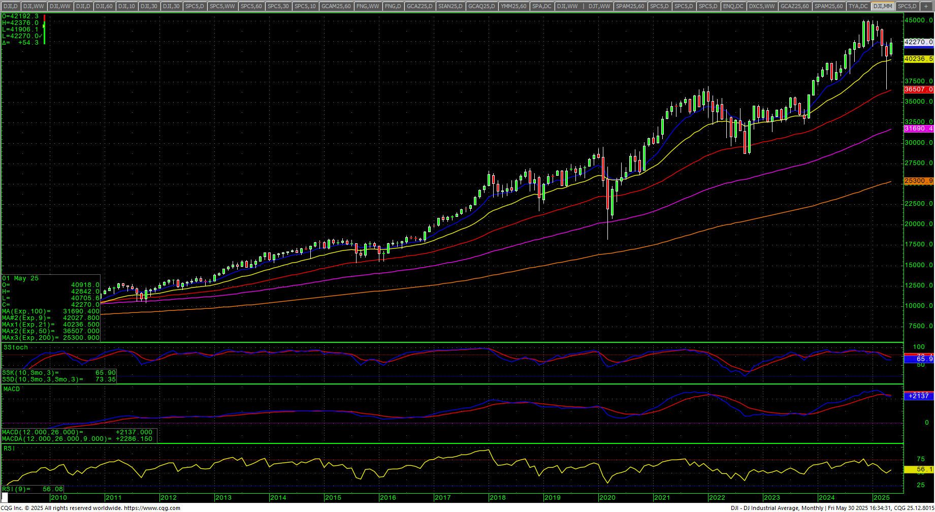 The Dow closed down +1.60% toward the upper end of an inside week’s range. The 50-day and 200-day MAs are close to issuing a Golden Cross. The weekly stochastics are still in an uptrend. Prices are still reacting to a critical area overhead against the 26 March 2025 high at 42822 (intraday high is 42842) and the ‘final’ “Death Zone” from record highs. That zone remains at 42943 through 43061. The 200-day MA starts the week at 41656.1 and is trending slightly higher.
