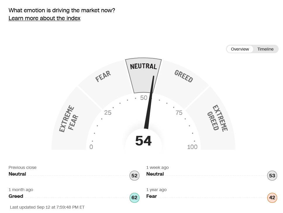 The CNN Fear and Greed Index moved to 54 and reads neutral. Breadth was flat on the week and reads greed. Latest AAII Sentiment Survey: Pessimism Pushes Higher . The Dow A/D drifted lower from the recent ATH closing at 6992. The VIX held in a tight range and closed on the lows, down -2.77%. The Put/Call closed at 0.63 and reads extreme greed. The 52-week, A/D moved up to +3.68% and reads extreme greed. The Dow closed the week up +0.95%, closing in the top of the week’s range at a record high. The S&P traded record highs and settled up +1.59% in the upper end of the range. The Nasdaq Composite was up +2.03% and the Nasdaq 100 was up +1.86% both at record highs. The NYSE FANG closed up +1.84% in the top of the range at a new ATH and is up +54.20% from the April lows. The Russell was up +0.25% in the upper half of the range. The 10-year notes closed flat on the bottom of the. The yield on the 10YR was flat at 4.068%.