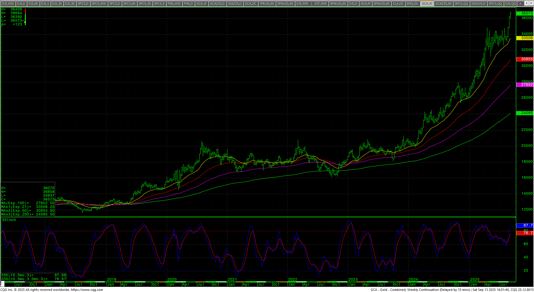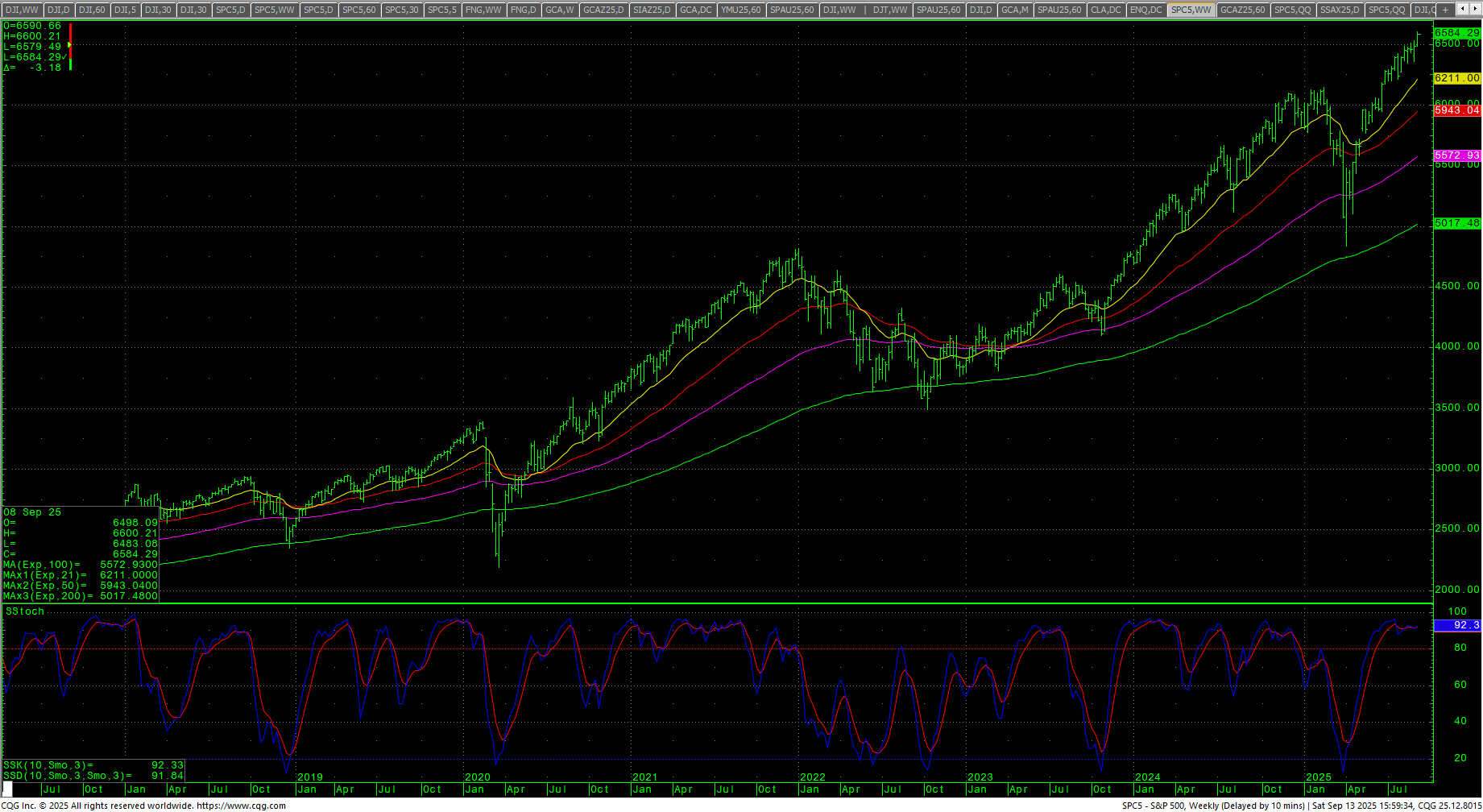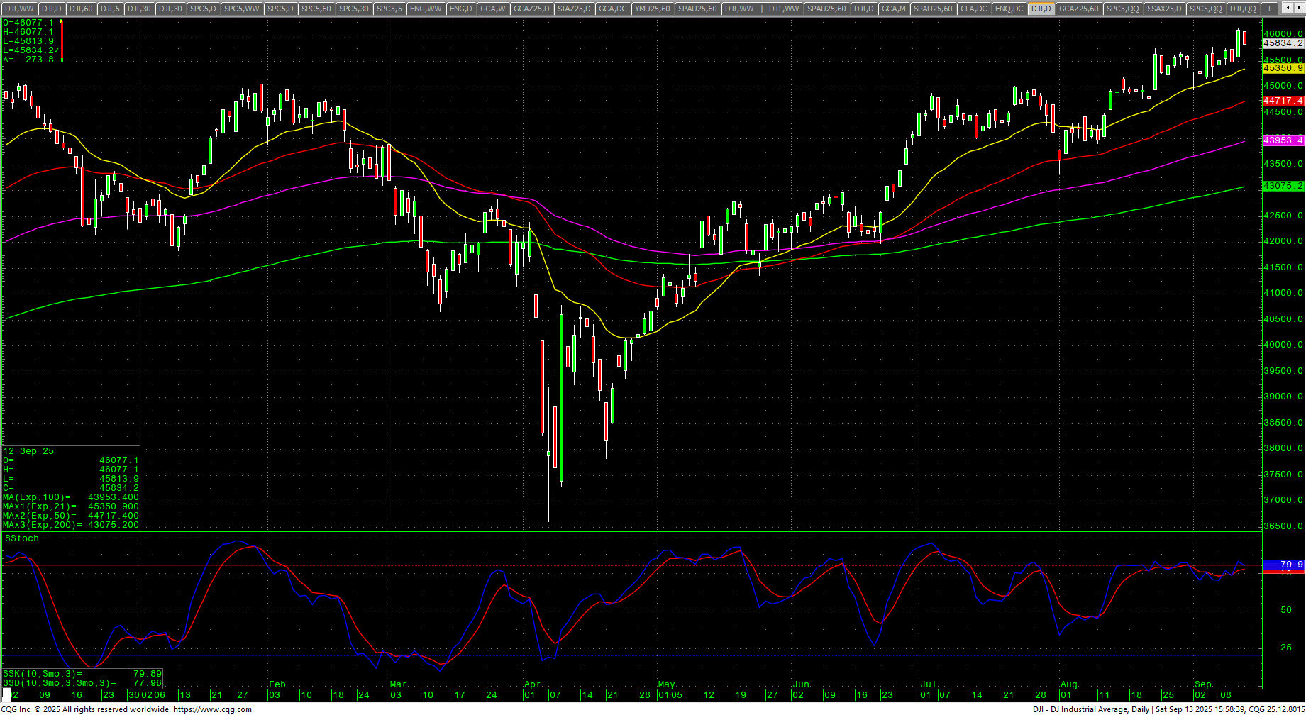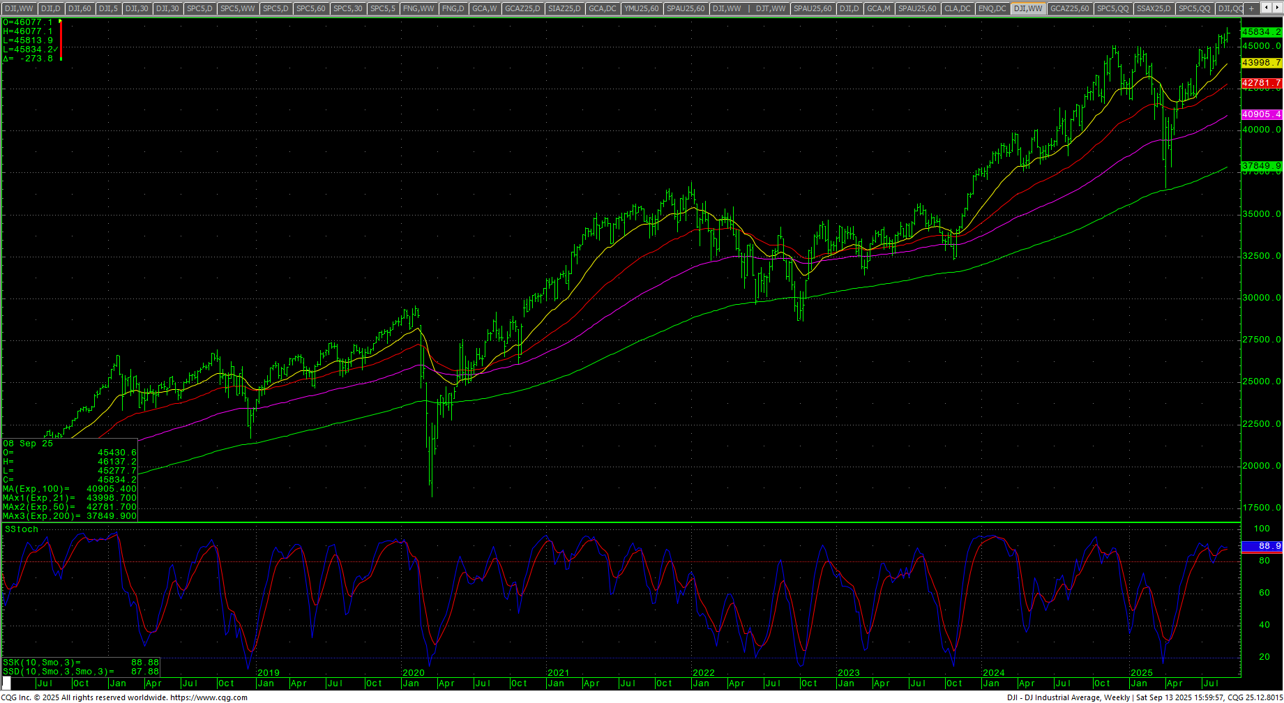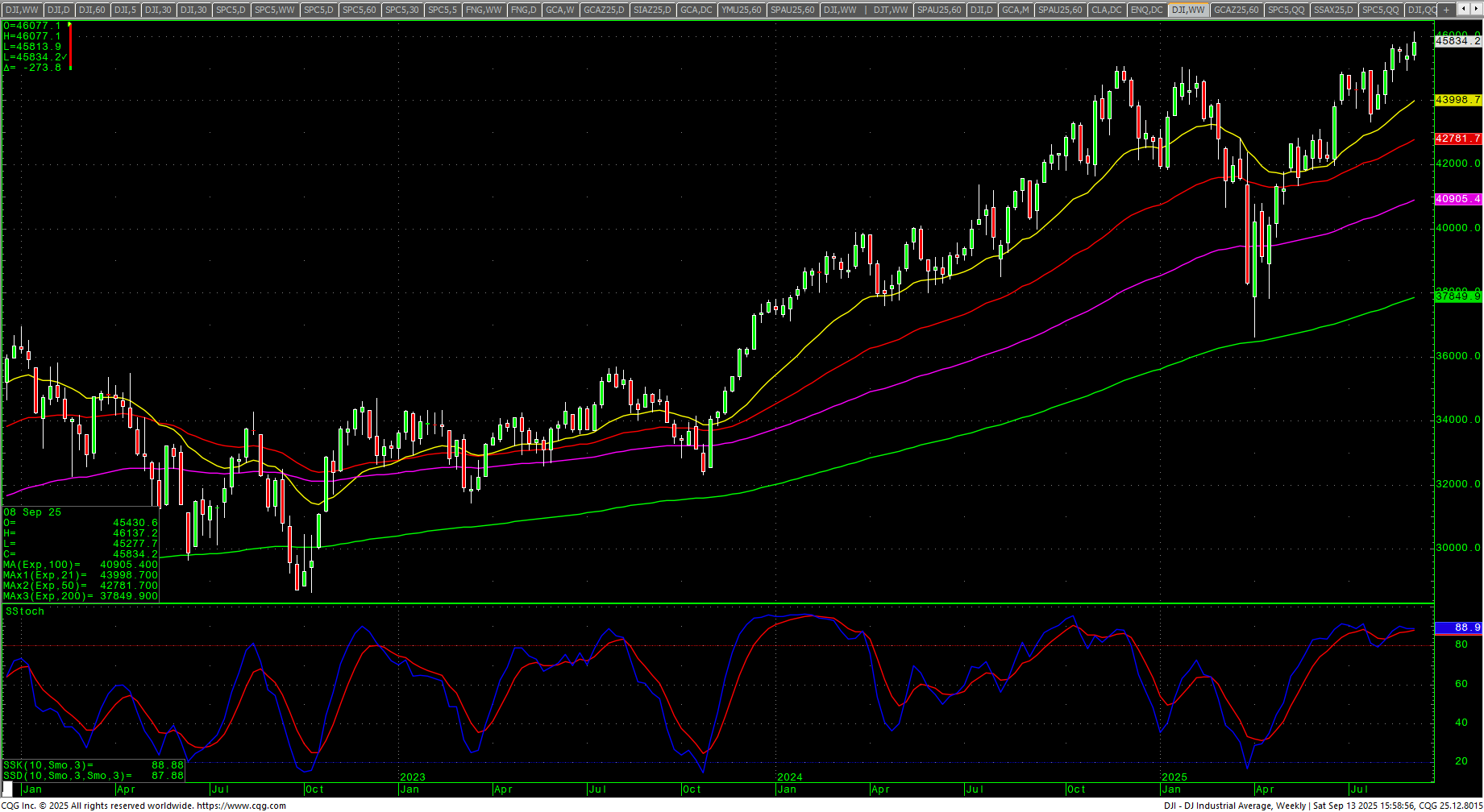 The Dow closed the week up +0.95% on the upper end of the range setting new all-time highs. The daily stochastics and MACD are up with preliminary bearish divergences. The daily RSI is 59.8. The 200-day MA starts the week at 43075.20 and is at record highs.