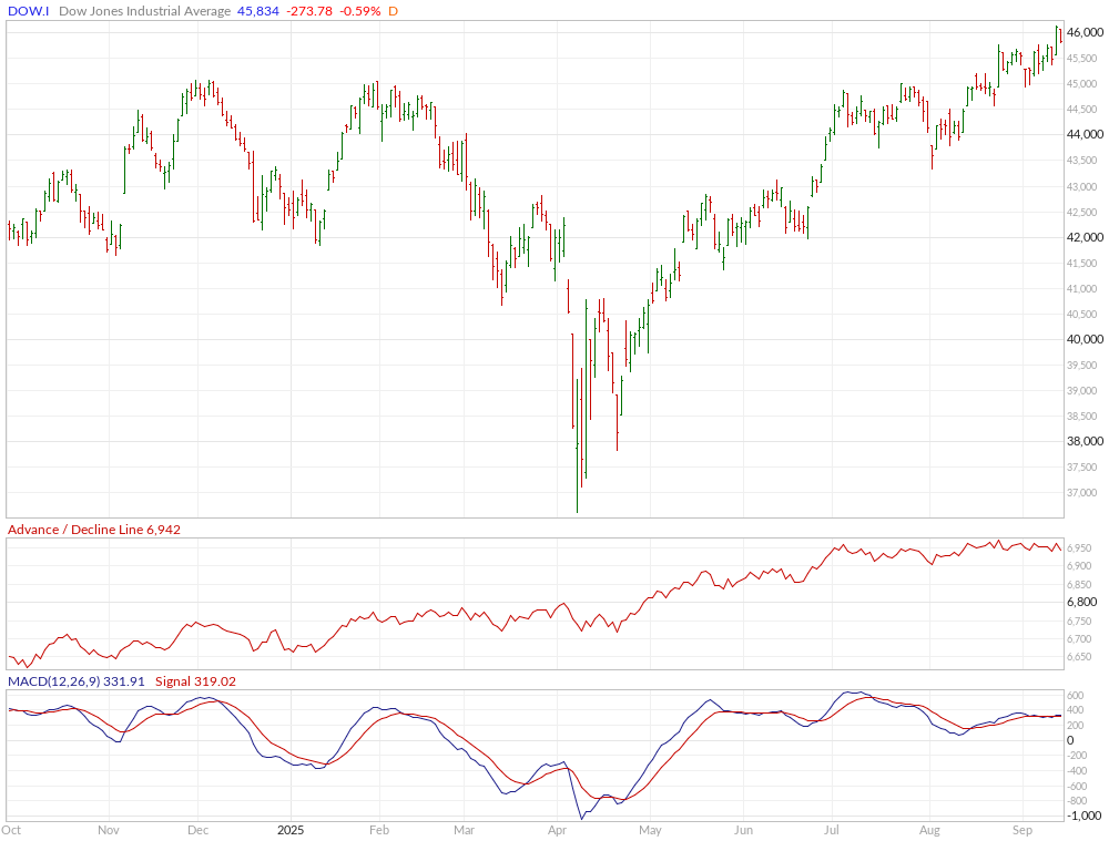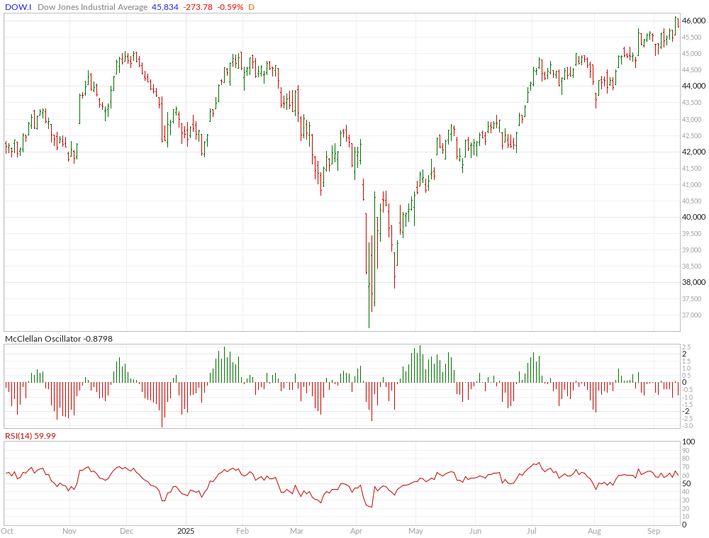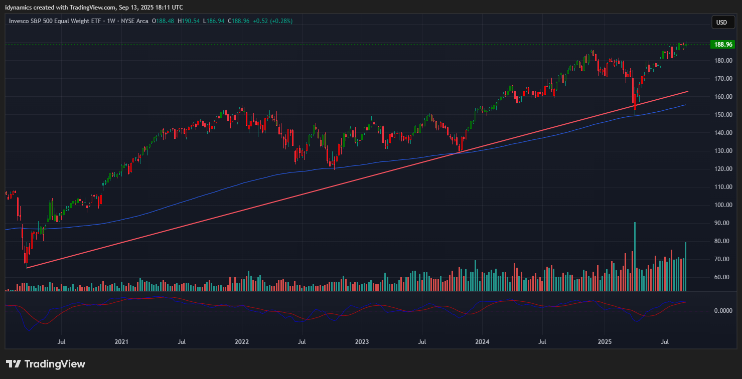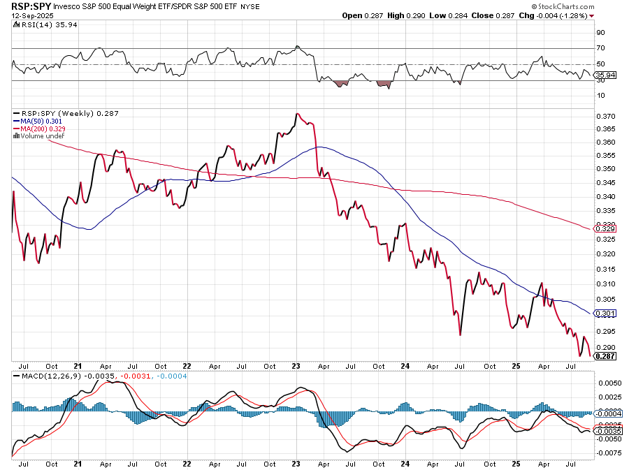 The RSP:SPY continues to drag into multi-year lows. The weekly is trending lower in an oversold position and the MACD is down. Resistance is still .294. The IWM tested record highs and closed in the middle of the range up +0.24%. The RSP set a record high and settled the up +0.28% in the middle of the range. NVDA roared back on the $ORCL news and closed on high of the week, up +6.47%. Bitcoin also bounced back and closed up +4.35%. Support remains pivotal at 110/108. McClellan Oscillators are neutral for the Dow. The Yield Curve expanded early and then narrowed, closing at +0.506%. The 10YR yield was flat, closing at 4.068%. Truflation jumped to 2.15%. Corporate bond spreads are at a 27-year low.