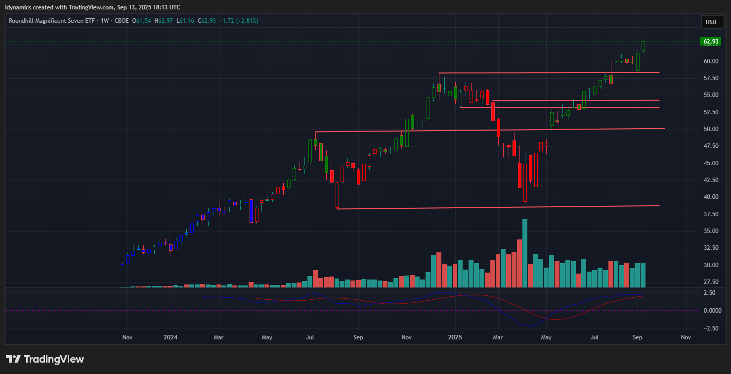 The MAGS moved to a record high on the week and closed on the highs, up +1.72% as prices near the target area of 63.04 and 64.50. Support remains at 58 and key against the 54.16/53.14 level. Both the SOX and SMH set record highs and closed at the top end of their ranges. $ORCL closed out the week up +25.51%.