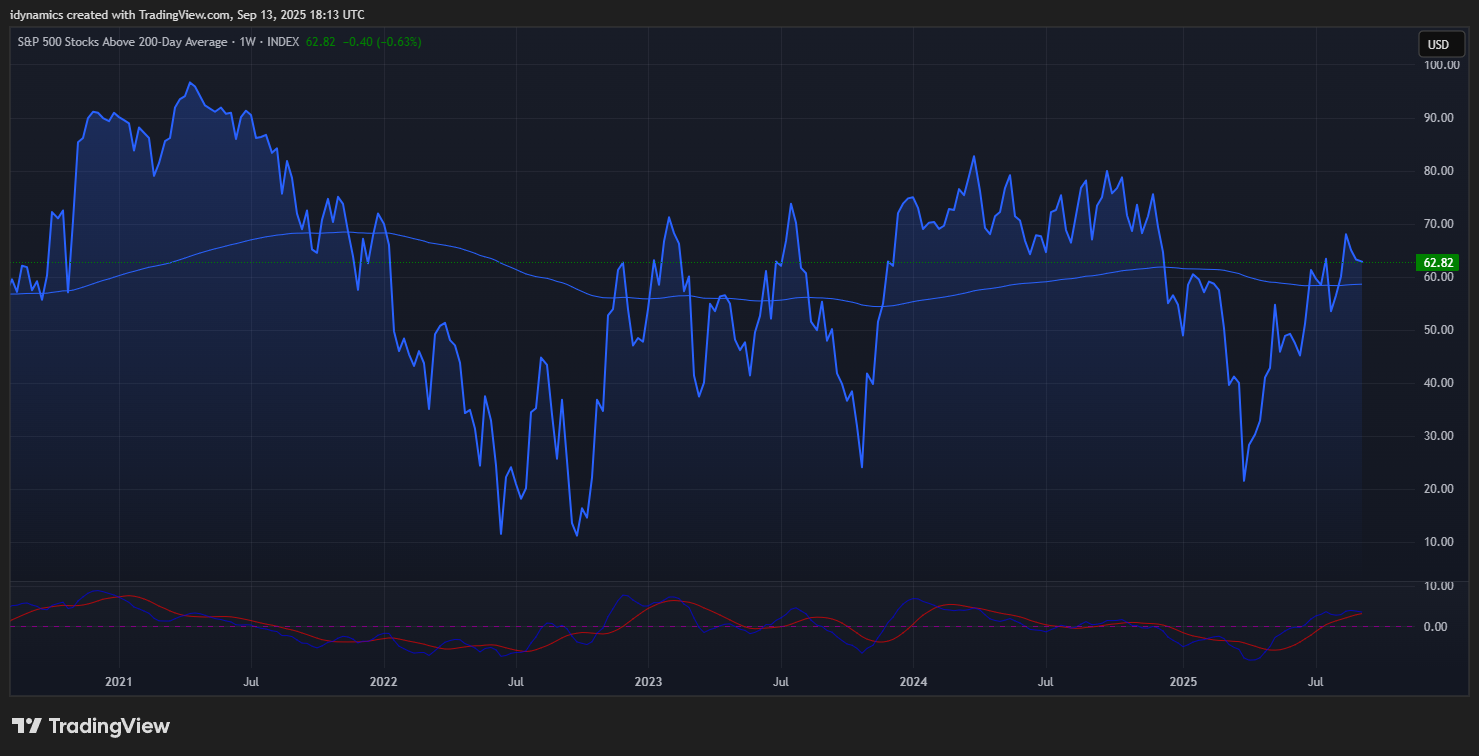 Breadth was flat for the SPX on the week, declining to 62.82%. The high in September 2024 was 72.92% and 82.70% in March of 2024. Divergence is still the name of the game.