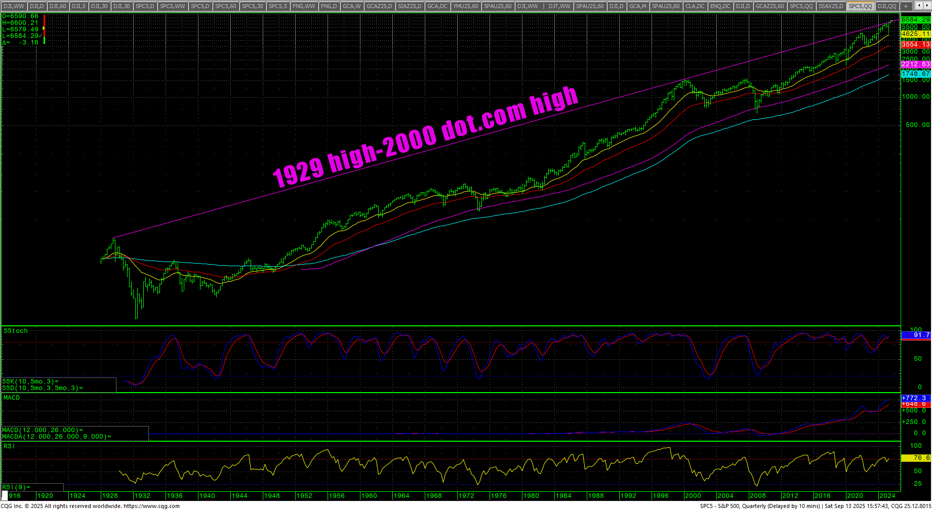 Yes, the markets are extremely overvalued/inflated right now…but sentiment is not manic, and we are not seeing the type of whipsaw volatility that comes when a major top is in process. The AAII still has more bears than bulls and every selloff brings players into the puts. Remember that the top 10% of the country owns 93% of the stock market. They hold 70% of the total value of stocks. The game now is how can they keep ten stocks up with promises of some imaginary AI Revolution. Ten stocks that make up 40% of the market. TEN. With the SPX moving above the trendline from the 1929 highs through the 2000 dot.com highs, will it now “melt up” to some of the Street targets being bandied about now such as 7000? Dow Jones 50K? 55K?