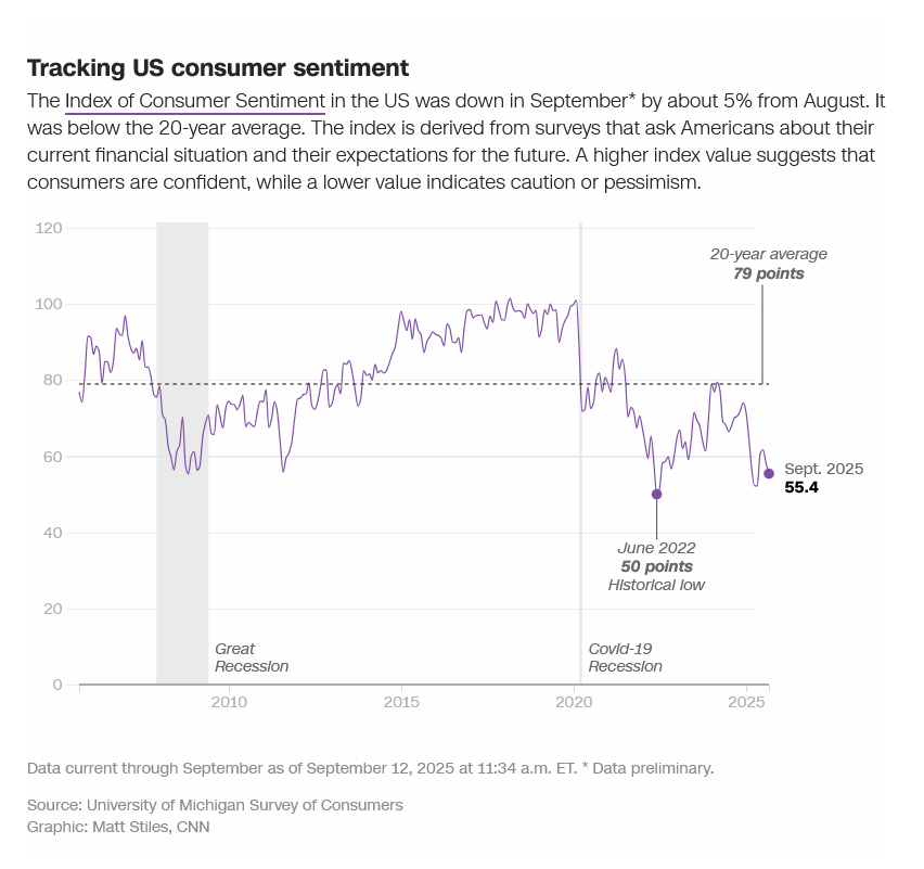 And yet Consumer Sentiment is still deteriorating as the “Vibecession” continues with prices rising for consumers and inventory purchased ahead of the tariffs dwindles. Prices keep climbing the Wall of Worry with the enticing belief that the Fed will pour more kerosene on the conflagration.