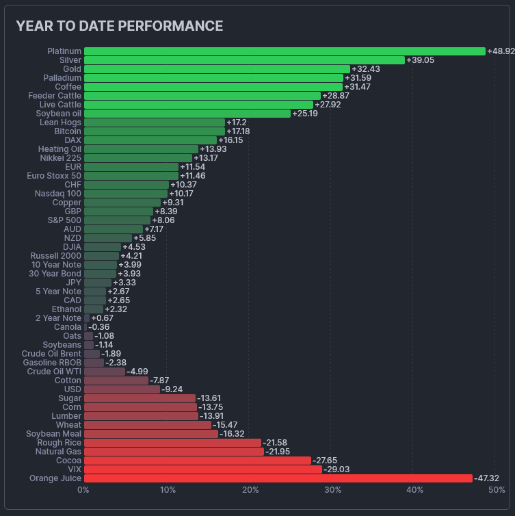 The CRB Index was up +0.54%. Crude oil held in an extremely tight range and closed up slightly. The XLE rallied back as it congests just under the recent tops. Gold rallied to record highs for the spot futures as it tested the $3700 level. Silver exploded to the highest levels since 2011 and cleared the $42 level. The CoT for the S&P 500 shows asset managers holding steady with small specs adding slightly. The CFTC S&P 500 Non-Commercial Net Positions ended at -173.7K.