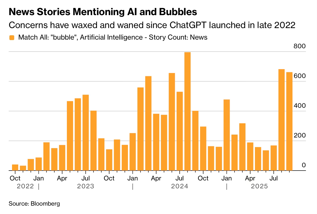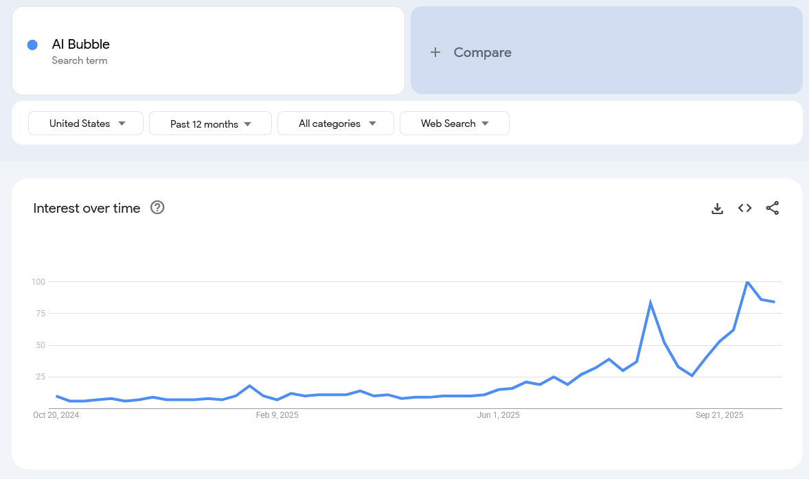 Speaking of which, searches for “AI Bubble” have surged this year. No wonder sentiment is in FEAR. When everyone knows it is a bubble, the fat lady most definitely is not singing. The BIG question that remains with this circular, daisy-chain of funding amongst the big players is, Where is the energy going to come from to power this trillion+ dollar “data center” CAPEX?