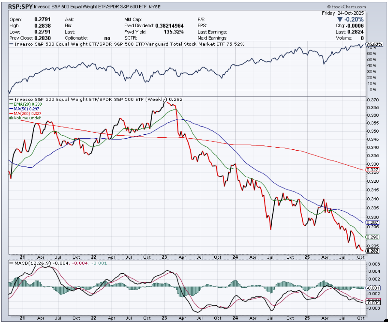 Breadth improved slightly on the week with the share of SPX stocks above the 200-day MA moving to 62.62%. The high in September 2024 was 72.92% and 82.70% in March of 2024. Divergence remains the name of the game. 10 stocks make up 40% of the SPX.
