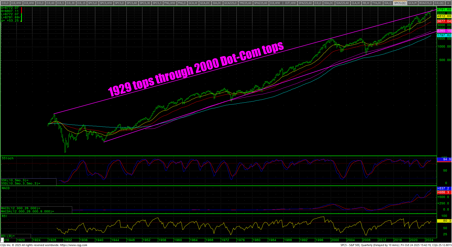 The SPX quarterly keeps alive the super bull scenario as prices break away from the overhead trendline that connects the 1929 tops through the 2000 Dot-Com tops. If prices start to trade back under the trendline, it could signal selling in equities. It also holds potential for a blowoff move.