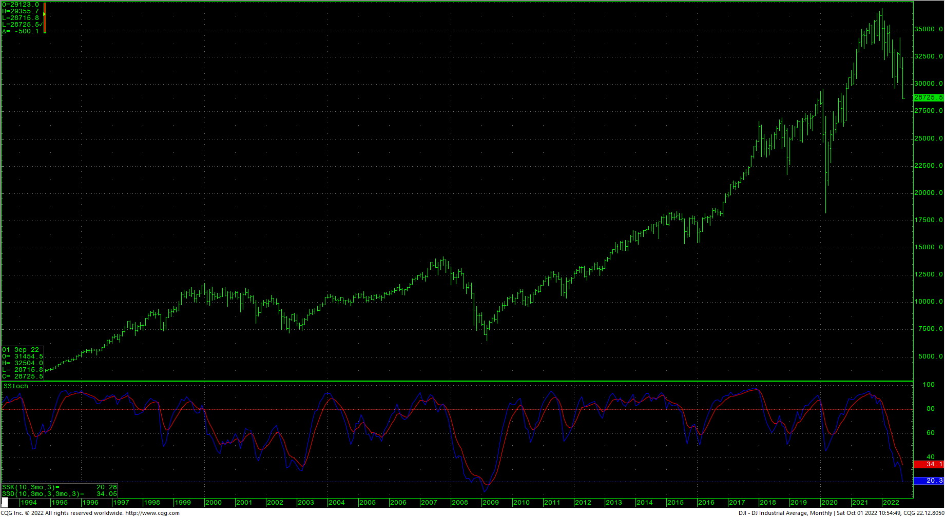 The DJIA saw a minor reprieve form the selloff in the critical timing window outlined in the last update and plunged again late in the week to close down 2.93% for the third straight week of steep declines on the weekly. For the month of September, the DJIA was down 8.84%…the worst monthly performance since early 2020. Prices have now entered the long-standing gap area on the weekly that runs from 28902 to 28495. The DJIA is now down 22% from the record high close set on January 4th of this year. The daily is oversold while the weekly is just hooking lower in the stochastics with the past three weeks of nearly straight down trade. The market enters October in an extremely vulnerable position and even though sentiment remains bearish, it has not reached extreme levels.