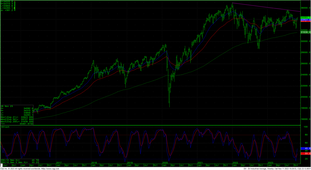 As mentioned, sentiment is mixed with some lingering EXTREME FEAR. The AAII Sentiment: Saw Optimism Surging Last Week. The VIX closed lower as it moves back toward the 2023 lows. The 52-week, A/D moves slightly higher to -5.94% which still indicates extreme fear. The Put/Call ratio sits at 0.95, another fear reading. The Dow closed the week up +0.65%. The S&P was up +1.35%. The Nasdaq ended the week up +2.37%, the FANG rallied sharply through the upper trendline of the bull flag pattern on the weekly, closing up +4.63% while the Russell struggled all week and closed down -3.15. The bond market stalled out and the 30-year closed slightly lower in a tight weekly reversal, closing on the low of the range. The CRB closed down sharply, -3.04%, as crude oil and gold plunged lower. The Commitment of Traders CoT shows commercials and Asset Managers selling into this rally. The next timing point is this coming Friday and marks critical timing.