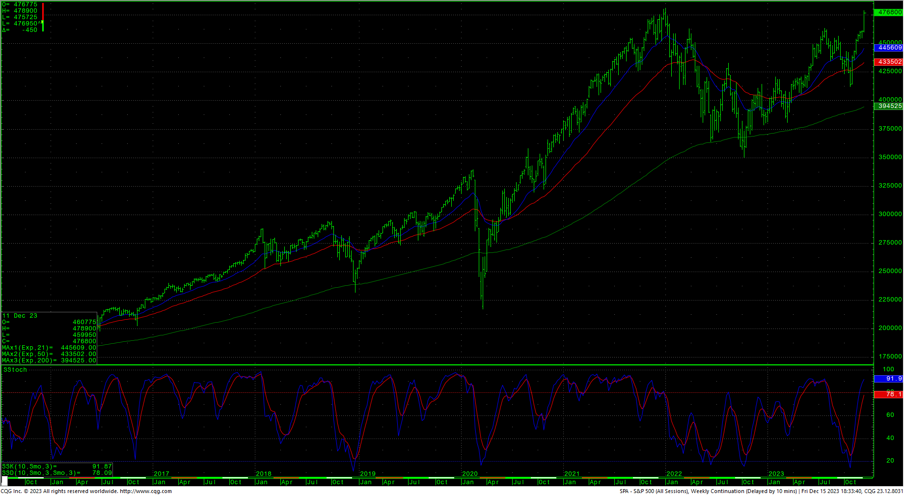 Sentiment has moved into greed readings. Last week in the AAII, Optimism Rises to Highest Level in Five Months; Pessimism Falls to Lowest Level in Six Years. The VIX moved to the lowest weekly close since January 2020. The Put/Call ratio moved to 0.69 which reflects extreme greed. The 52-week, A/D moved higher to +4.37% which indicates extreme greed. The Dow closed the week up +2.92%. The S&P was up +2.49%. The Nasdaq ended the week up +2.85%, the FANG moved to an all-time record high close up +3.63% and the Russell closed up +5.55%. The bond market continued higher, with the 30-year futures set the highest weekly close since 24 July 2023. The CRB was up +0.6584%…crude oil closed up $0.20, the first higher close in 7 weeks while gold settled slightly higher on the week. The CoT is showing buying coming from asset managers and small speculators now while major players remain on the sidelines.
